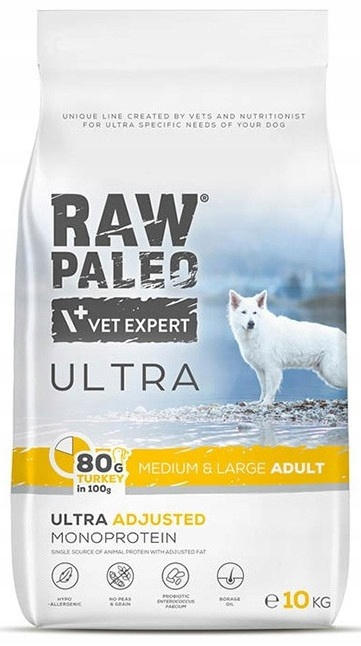 Karma Raw Paleo Ultra Medium & Large Adult Turkey to kompletna karma przeznaczona dla dorosłych psów ras średnich i dużych (powyżej 12. miesiąca życia dla ras średnich lub 15. miesiąca życia dla ras dużych) o masie ciała przekraczającej 8 kg. Jest to karma hipoalergiczna i monoproteinowa, co oznacza, że bazuje wyłącznie na jednym źródle białka - indyku, oraz ma dostosowane do tego źródło tłuszczu - tłuszcz indyczy. Receptura pozbawiona jest grochu i zbóż, co czyni ją odpowiednią dla psów z delikatnym układem trawiennym. Dodatek oleju z ogórecznika wspiera zdrowie skóry i sierści, a obecność probiotyku Enterococcus faecium wpływa pozytywnie na równowagę mikroflory jelitowej, ułatwiając trawienie i przyswajanie składników odżywczych.