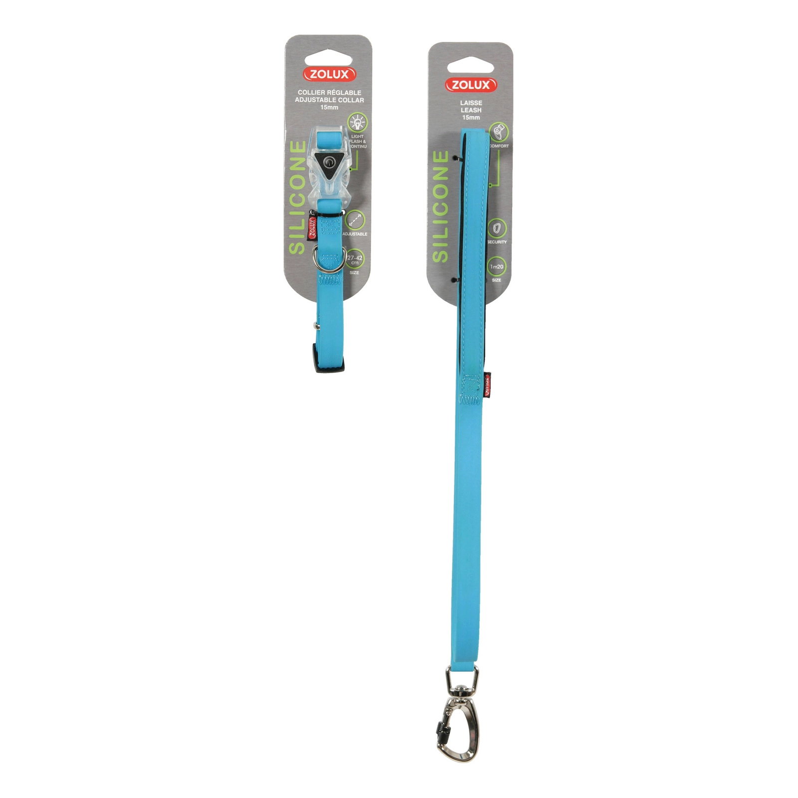 *- Zestaw ZOLUX Obroża silikonowa regul. 15 mm kol. niebieski + ZOLUX Smycz silikonowa 15 mm kol. niebieski (463894BLE + 463897BLE)