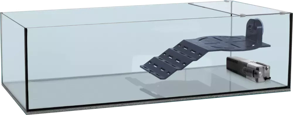 KARAPAS PRIMO Aqua to akwaterrarium dla małych żółwi wodnych dostępne w rozmiarze 70 i 90, które odpowiadają pojemności 38 L i 85 L. Zestaw składa się ze szklanego zbiornika, szklanej pokrywy na część zbiornika z czterema plastikowymi klipsami, regulowanego filtra przepływu, platformy wykonanej z plastiku z recyklingu oraz z zabezpieczającej maty piankowej do umieszczenia pod zbiornikiem.