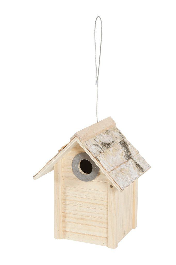 Budka dla ptaków wykonana z naturalnego drewna z daszkiem pokrytym korą brzozową.