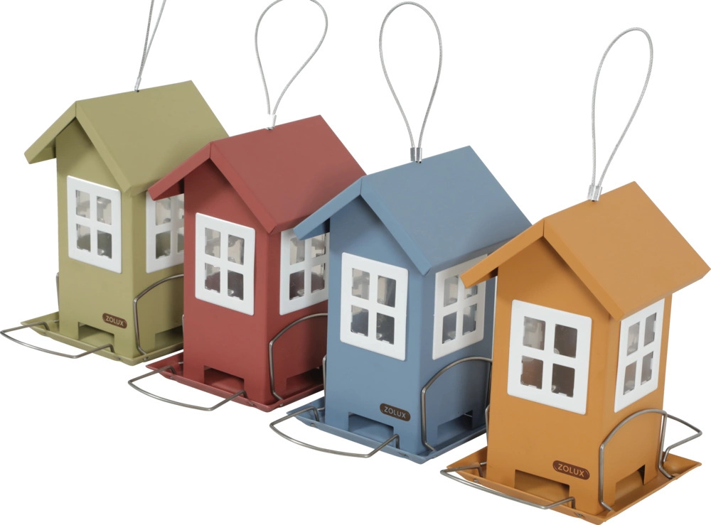 Praktyczny, elegancki i solidnie wykonany z metalu i plastiku karmnik w kształcie domku z 4 oknami nie tylko zapewni pożywienie ptakom, ale będzie także ozdobą otoczenia. Dzięki metalowemu łańcuszkowi, karmnik można powiesić na balkonie, tarasie lub w ogrodzie. Karmnik dostępny jest w czterech kolorach: szaroniebieskim, oliwkowym, ceglastym i miodowym.