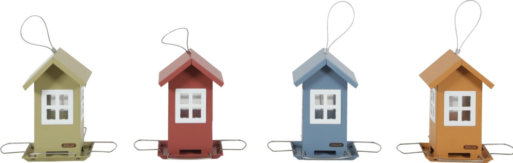 Praktyczny, elegancki i solidnie wykonany z metalu i plastiku karmnik w kształcie domku z 4 oknami nie tylko zapewni pożywienie ptakom, ale będzie także ozdobą otoczenia. Dzięki metalowemu łańcuszkowi, karmnik można powiesić na balkonie, tarasie lub w ogrodzie. Karmnik dostępny jest w czterech kolorach: szaroniebieskim, oliwkowym, ceglastym i miodowym.