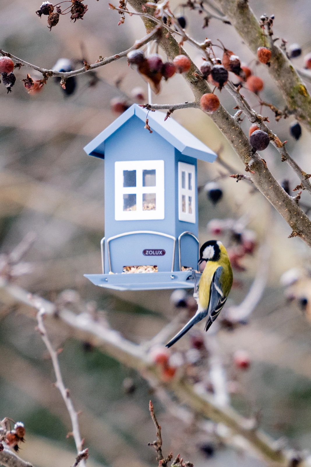 Praktyczny, elegancki i solidnie wykonany z metalu i plastiku karmnik w kształcie domku z 4 oknami nie tylko zapewni pożywienie ptakom, ale będzie także ozdobą otoczenia. Dzięki metalowemu łańcuszkowi, karmnik można powiesić na balkonie, tarasie lub w ogrodzie. Karmnik dostępny jest w czterech kolorach: szaroniebieskim, oliwkowym, ceglastym i miodowym.