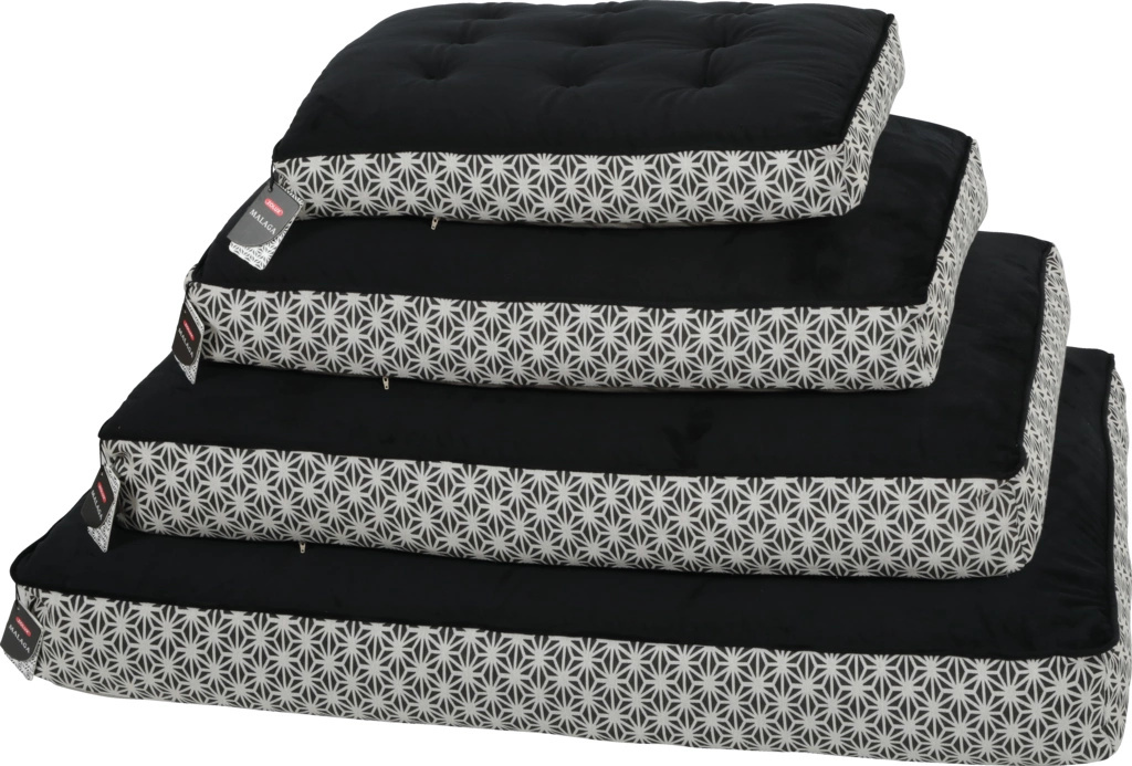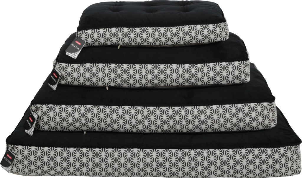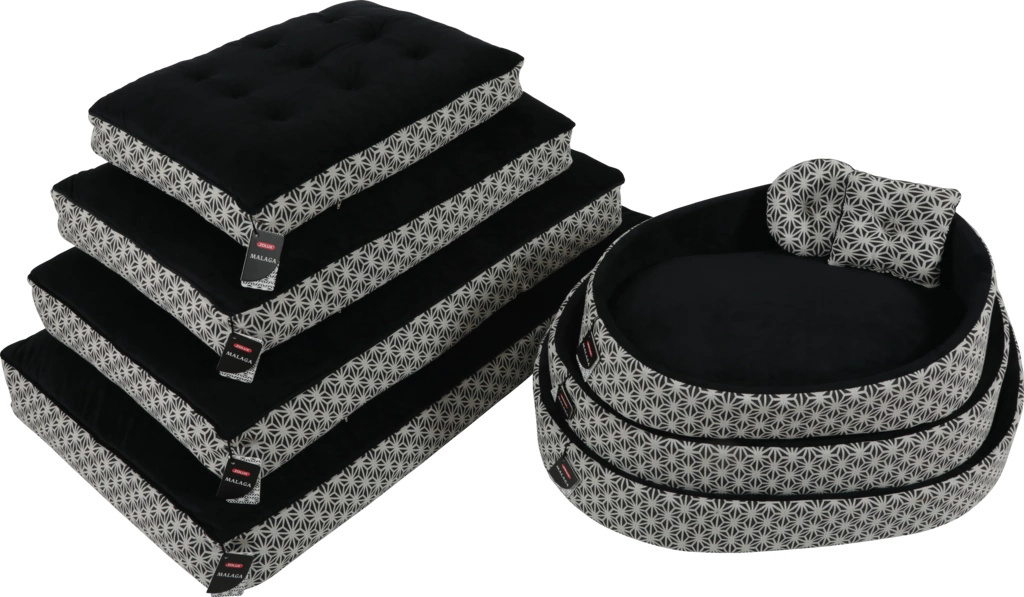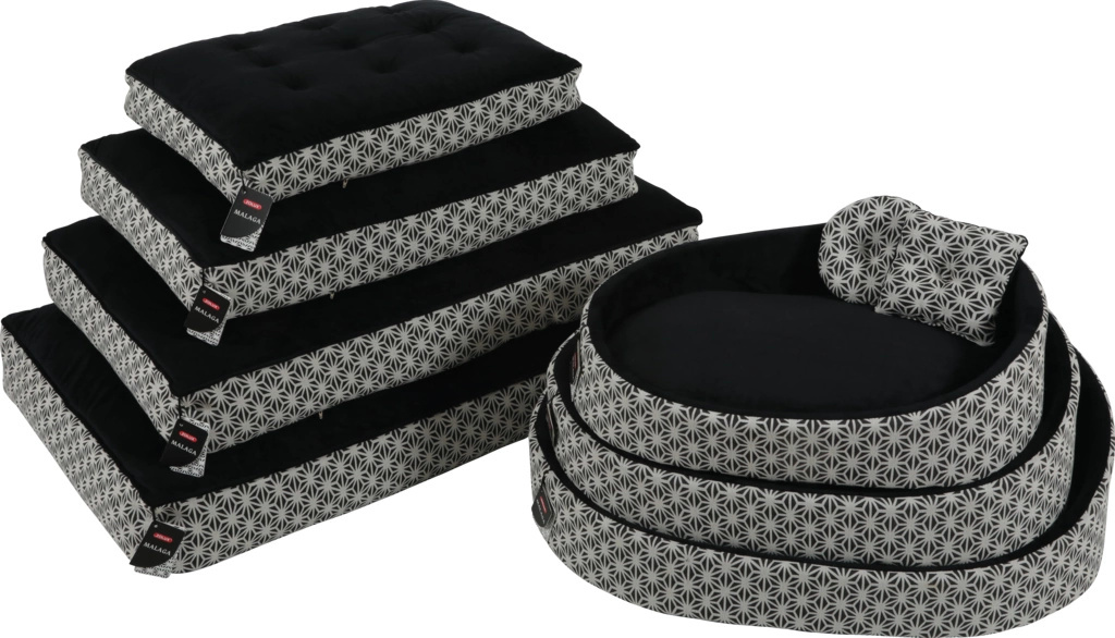 Kolekcja czarno-białych legowisk premium dla psów MALAGA to połączenie wygody z doskonałym wzornictwem. W jej skład wchodzą legowiska z izolującą poduszką piankową (dostępne w trzech rozmiarach) oraz pikowane poduchy typu chesterfield (dostępne w czterech rozmiarach). Pokryte bardzo grubym, wytrzymałym materiałem (260g/m2) z nowoczesnym nadrukiem oraz miękkim, puszystym futrem syntetycznym, zapewnią psu komfortowy wypoczynek. Wszystkie poduszki posiadają zdejmowane poszewki, które można prać w pralce w temperaturze 30⁰, dzięki czemu łatwo utrzymywać je w czystości.