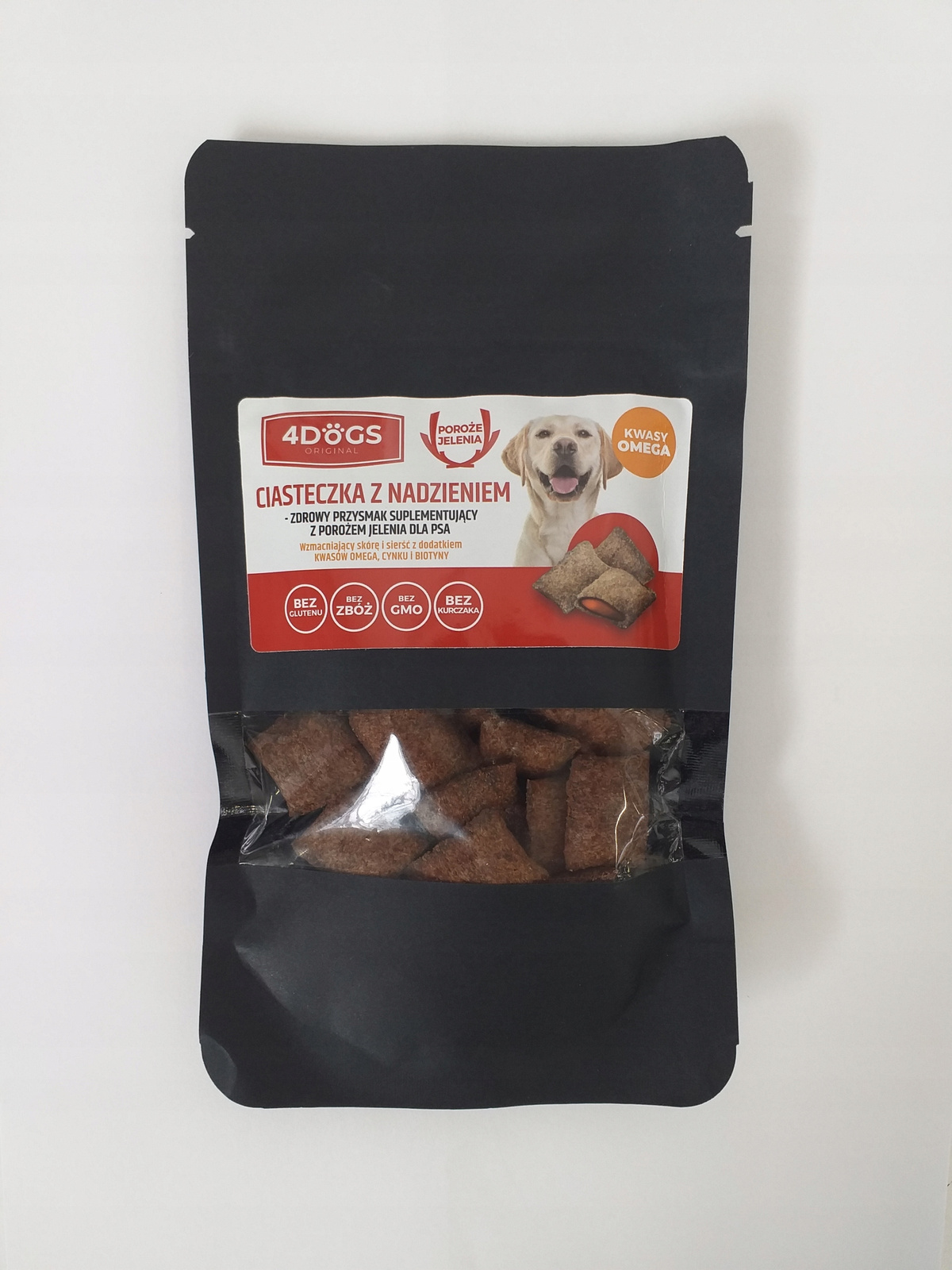 Ciasteczka 4Dogs z porożem z jelenia i suplementami nie są zwykłymi przysmakami. Dłuższe ich stosowanie pozytywnie wpłynie na funkcjonowanie Państwa pociechy.