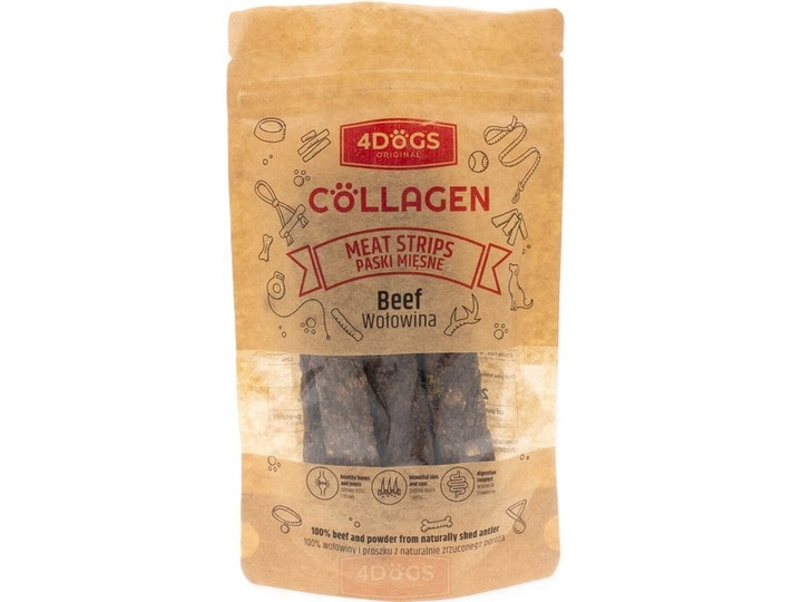 Rozpieść swojego psa wyjątkowym przysmakiem! Poczęstuj go Mięsnymi Paskami z Wołowiny marki 4Dogs, które wzbogaciliśmy sproszkowanym porożem jelenia! To więcej niż zwykłe przekąski – to prawdziwa uczta dla Twojego czworonożnego przyjaciela, która jednocześnie wspomaga jego dobrostan!