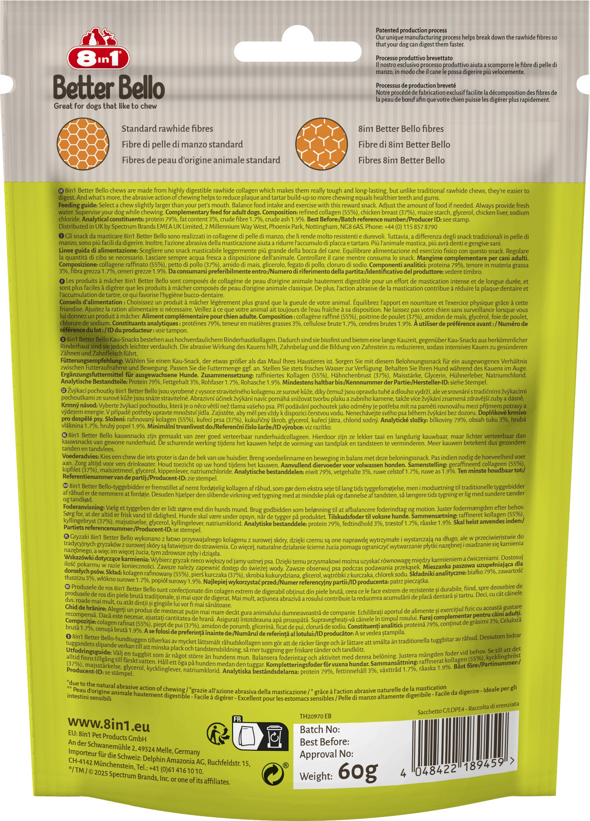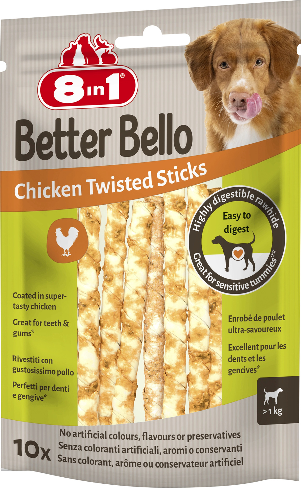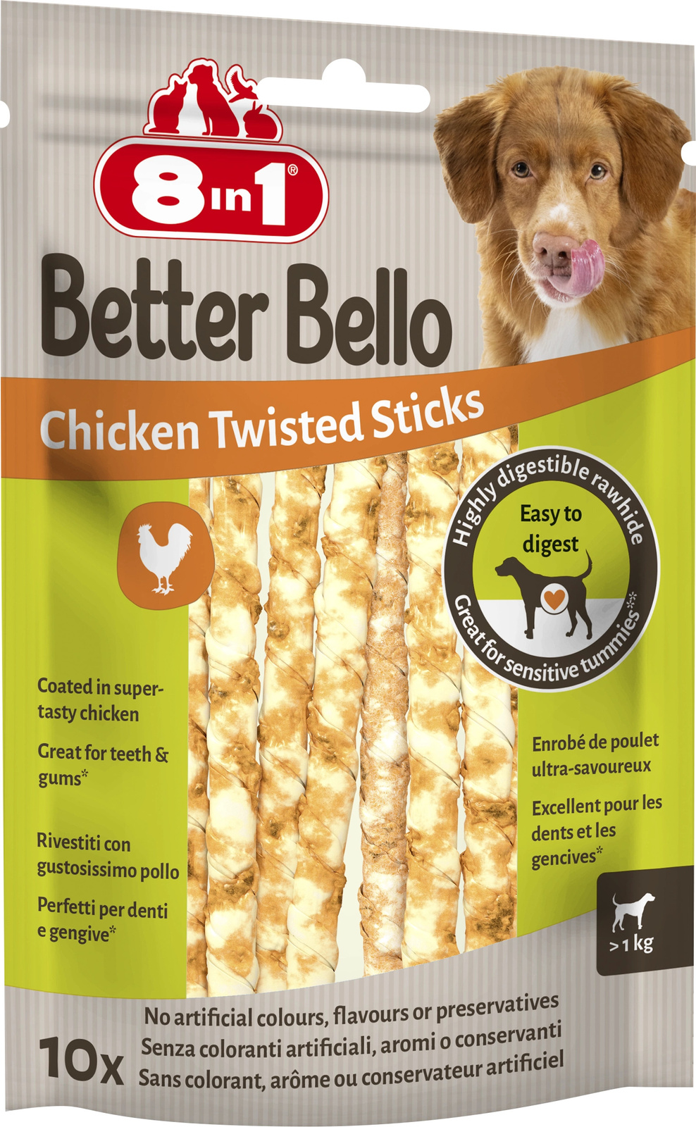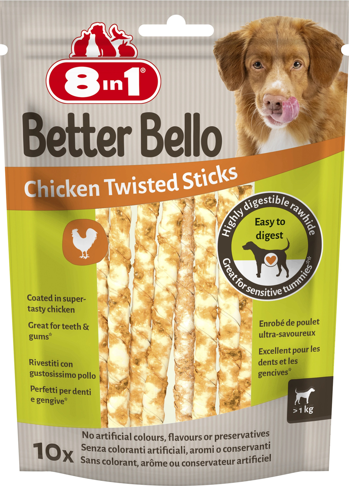 Pałeczki z kurczakiem 8in1 Better Bello Chicken Sticks są wykonane z lekkostrawnego kolagenu z surowej skóry, dzięki czemu są naprawdę wytrzymałe i wystarczają na długo, ale w przeciwieństwie do tradycyjnych gryzaków z surowej skóry są łatwiejsze do strawienia. Ponadto proces ścierania podczas żucia ogranicza gromadzenie się osadu i kamienia nazębnego, więc dłuższe żucie oznacza zdrowsze zęby i dziąsła.