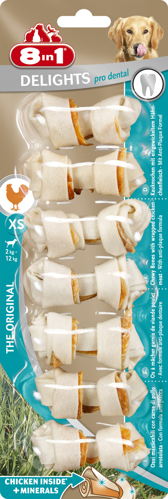 8in1 Delights Pro Dental to unikalne połączenie środka do pielęgnacji zębów, gryzaka oraz wyśmienitego przysmaku. Zawierają dużą porcję smacznego mięsa z kurczaka owiniętą twardą skórą wołową - z dodatkiem minerałów czyszczących zęby.