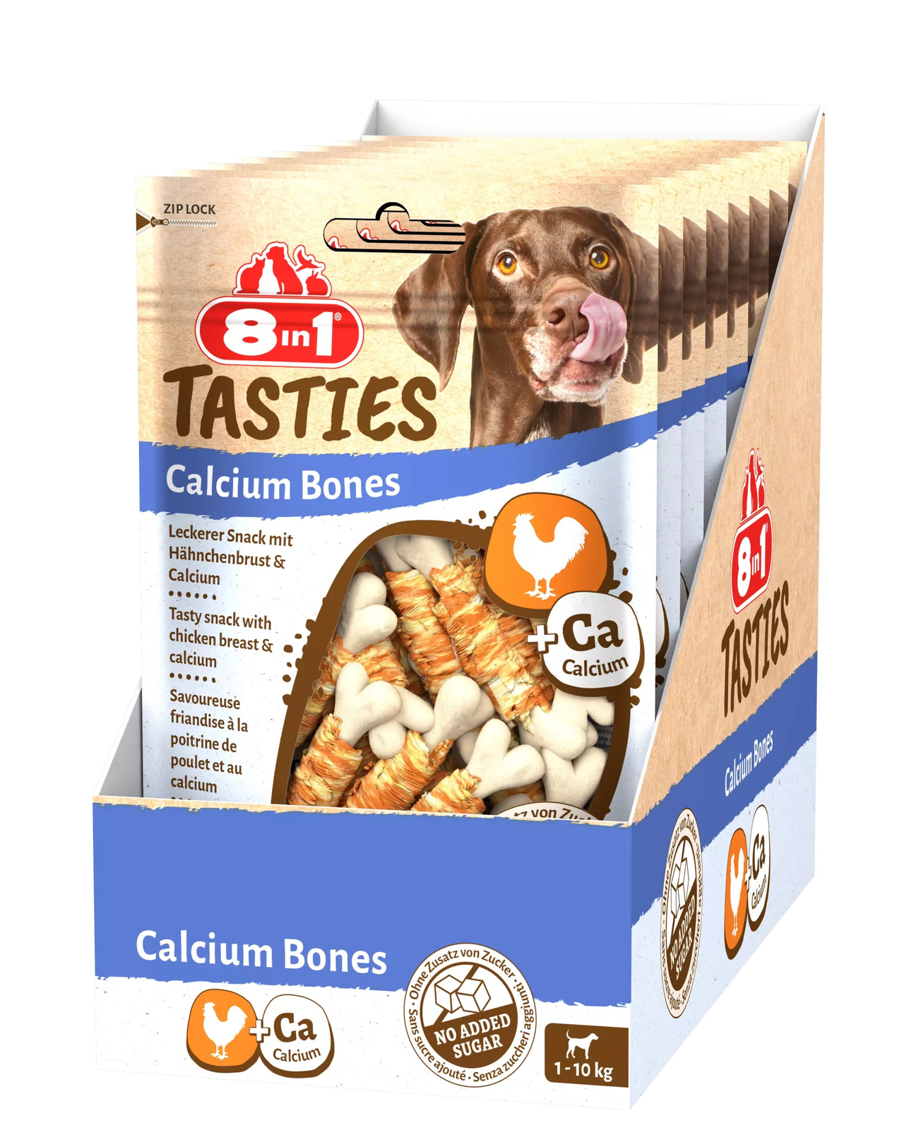 8in1 Tasties Kości wapniowe to przepyszne przekąski, które Twój pies pokocha. Wykonane są z pysznej piersi kurczaka owiniętej wokół kości wapniowej. Pożywne i zdrowe smakołyki idealnie nadają się jako nagroda między posiłkami. Są lekkostrawne, mają niską zawartość tłuszczu i nie zawierają dodatku cukru. 8in1 Tasties Kości wapniowe nie zawierają wzmacniaczy smaku, GMO, sztucznych konserwantów i barwników. Pieczone w piekarniku smakołyki są bogate w białko. 8in1 Tasties Kości wapniowe to idealna przekąska dla psów małych ras.
