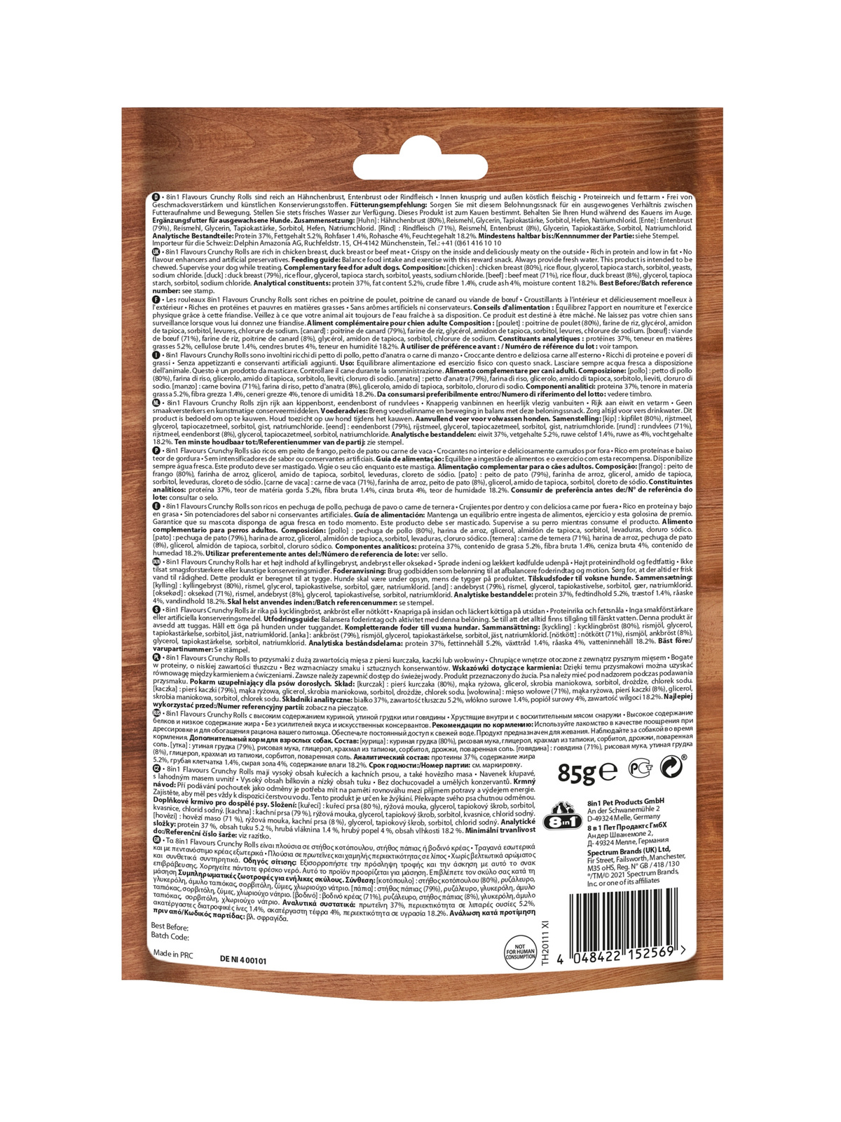 Nasze wyjątkowe 8in1 Flavours Chrupiące rurki to smaczna, satysfakcjonująca przekąska, dostępna w trzech różnych smakach. Są bogate w pierś z kurczaka, pierś z kaczki lub mięso wołowe. Twój pies pokocha te wyjątkowe smakołyki, które są niesamowicie chrupiące w środku oraz miękkie i delikatne na zewnątrz. Chrupiące rurki są bogate w białko i mają niską zawartość tłuszczu. Nie zawierają wzmacniaczy smaku, GMO i sztucznych konserwantów, są idealną przekąską dla psów każdej wielkości. Nie zawierają zbóż i glutenu - a dodatkowo są pieczone w piekarniku. Nasi czworonożni przyjaciele nie mogliby prosić o nic więcej!
