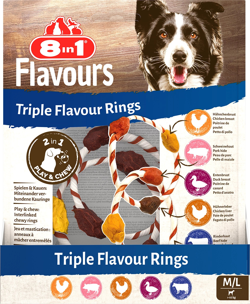 8IN1 Triple Flavour Rings: pyszne przekąski do żucia wyprodukowane ze skóry wieprzowej i wołowej, owinięte smakowitą wątróbką z kurczaka, a także piersią z kurczaka i kaczki. Zapewnia Twojemu psu zajęcie i przyjemność intensywnego żucia, co korzystnie wpływa na jego zęby i dziąsła*.