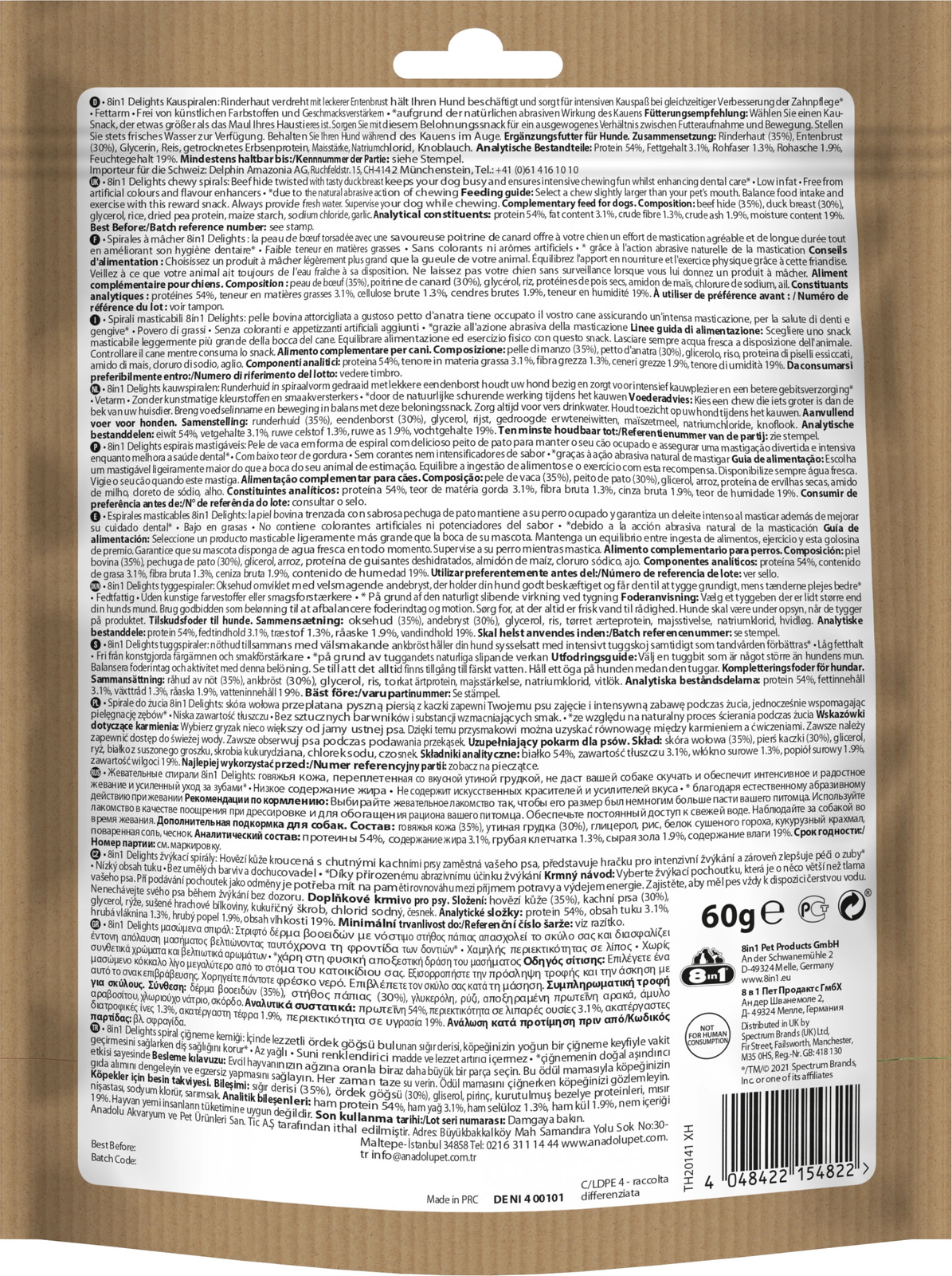 Spiralki 8in1 Delights Duck Spirals zawierają smaczną skórę wołową i pyszną pierś z kaczki, co zapewnia psom każdej wielkości intensywną przyjemność z żucia. Spiralki nie tylko zapewniają psu zajęcie, ale też pielęgnują zęby dzięki naturalnemu procesowi ścierania podczas żucia. Podając psu niskotłuszczowe przysmaki z serii Spirals, nagradzasz go pieczonym w piekarniku smakołykiem do żucia, który ma dużą zawartość białka i nie zawiera sztucznych barwników ani wzmacniaczy smaku. Produkt nie zawiera też cukru, GMO ani glutenu.