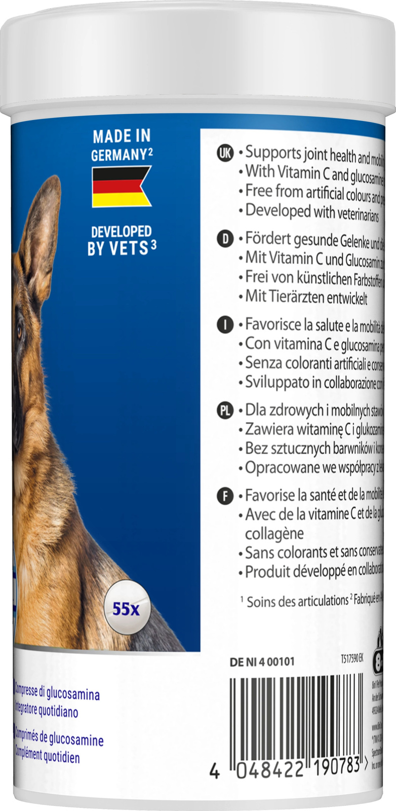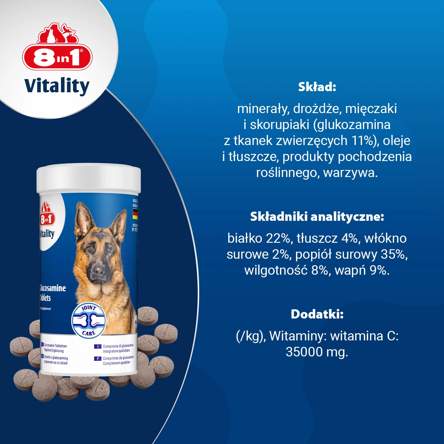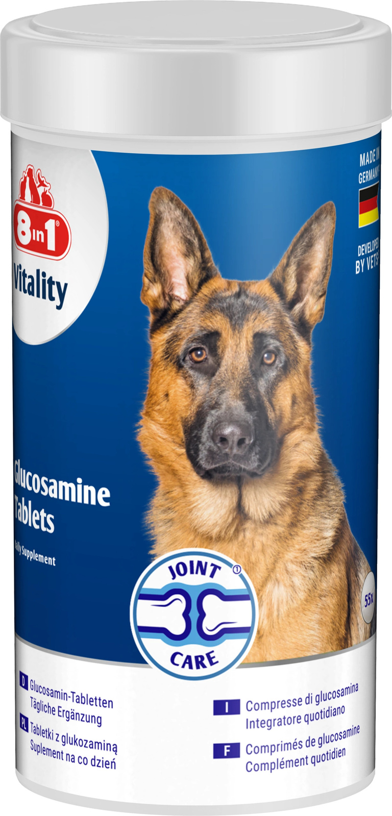8in1 Vitality Glukozamina to codzienny suplement diety przeznaczony dla dorosłych i starszych psów, który wspiera zdrowie stawów i utrzymanie aktywności fizycznej. Zawiera naturalną glukozaminę, witaminę C oraz przeciwutleniacze, które działają wspomagająco na chrząstki stawowe i ogólną kondycję układu ruchu. Produkt nie zawiera sztucznych barwników ani konserwantów, został opracowany we współpracy z weterynarzami i wyprodukowany w Niemczech.