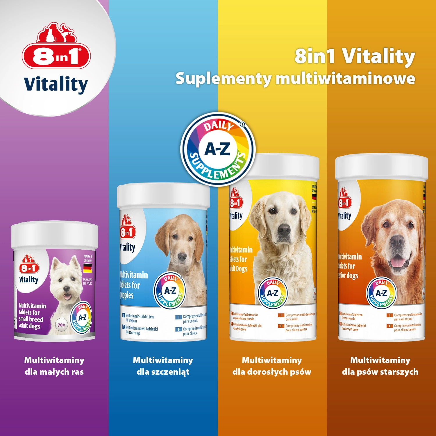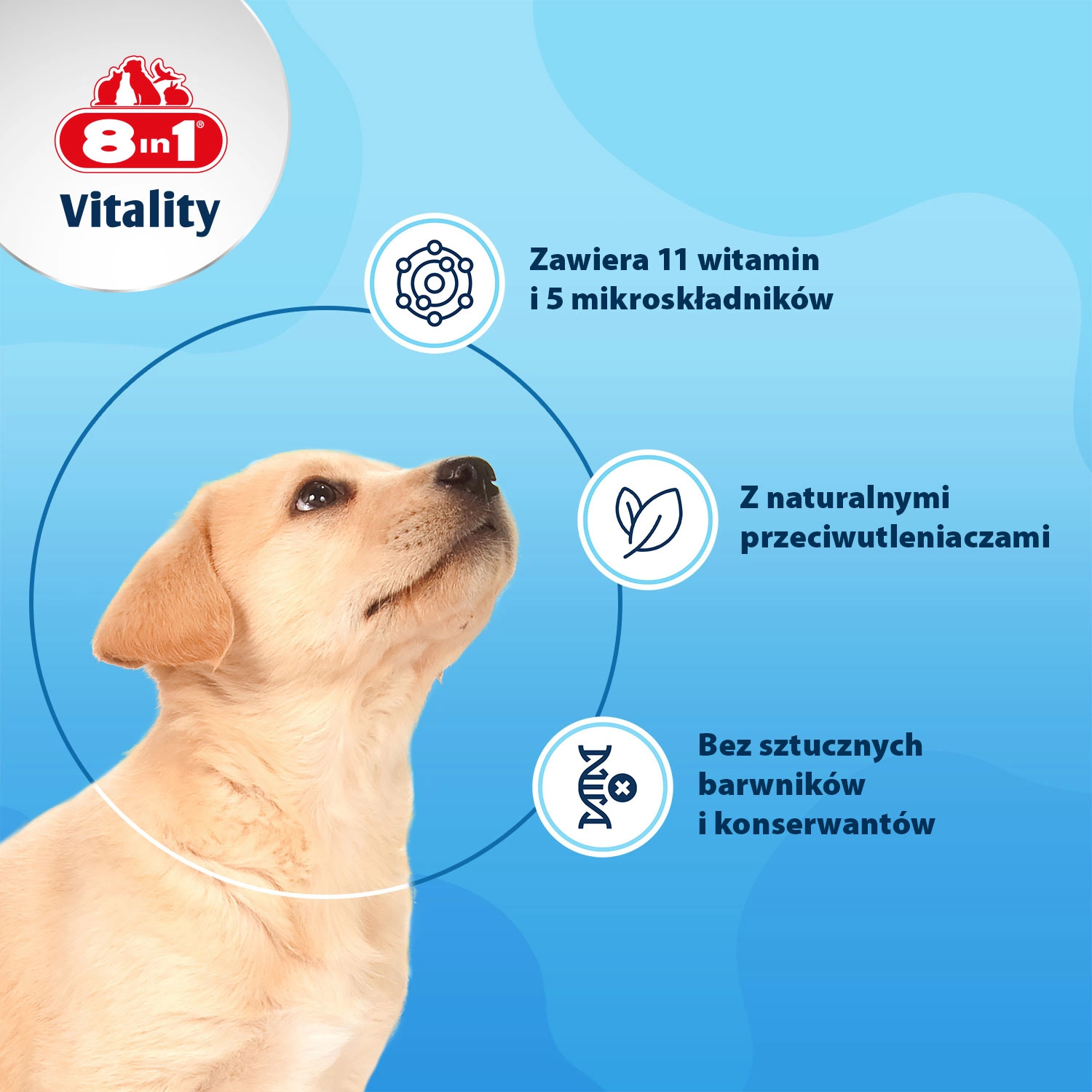 8in1 Vitality Multivitaminy dla szczeniąt to specjalistyczny suplement diety przeznaczony dla szczeniąt i młodych psów. Preparat zawiera zbilansowaną kompozycję 11 witamin oraz 5 mikroelementów, a także wysoką zawartość kwasów tłuszczowych omega-3 i naturalnych przeciwutleniaczy, które wspierają prawidłowy wzrost i rozwój młodego psa. Formuła została opracowana we współpracy z weterynarzami, nie zawiera sztucznych barwników ani konserwantów. Wyprodukowano w Niemczech.