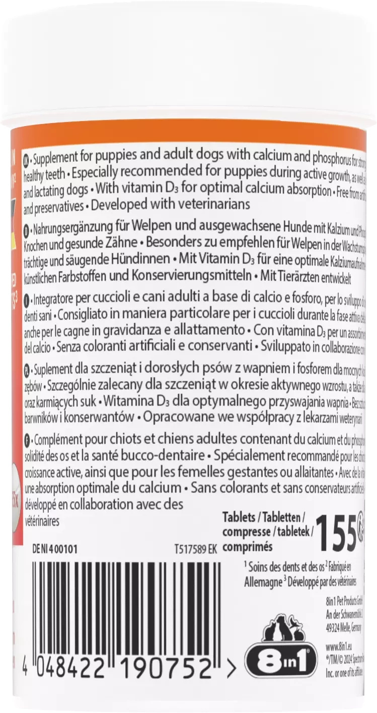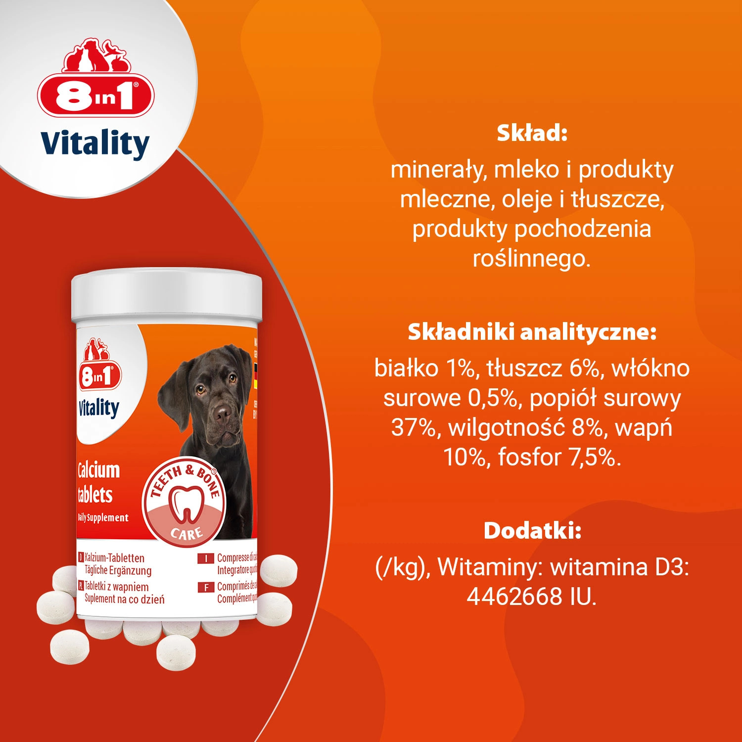 8in1 Vitality Wapń to kompleksowy suplement diety dla psów, którego głównym zadaniem jest wsparcie zdrowia kości i zębów. Zawiera wapń i fosfor – dwa podstawowe minerały odpowiedzialne za budowę i mineralizację kośćca – oraz witaminę D3, która wspomaga ich prawidłowe wchłanianie i wykorzystanie przez organizm. Tabletki zostały opracowane we współpracy z lekarzami weterynarii i nie zawierają sztucznych barwników ani konserwantów. Produkt jest odpowiedni dla psów wszystkich ras i grup wiekowych, a szczególnie polecany szczeniętom w okresie intensywnego wzrostu. Wyprodukowano w Niemczech.