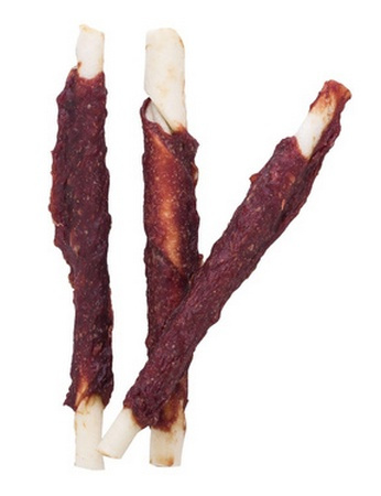 - Filety z wołowiny na patyku Karma uzupełniająca dla psów. Skład: mięso wołowe 48.8%, skóra suszona 45%, glicerol 2%, sorbitol 2%, sól 0.2%, skrobia 2% Typowa analiza: białko surowe 60%, tłuszcz...