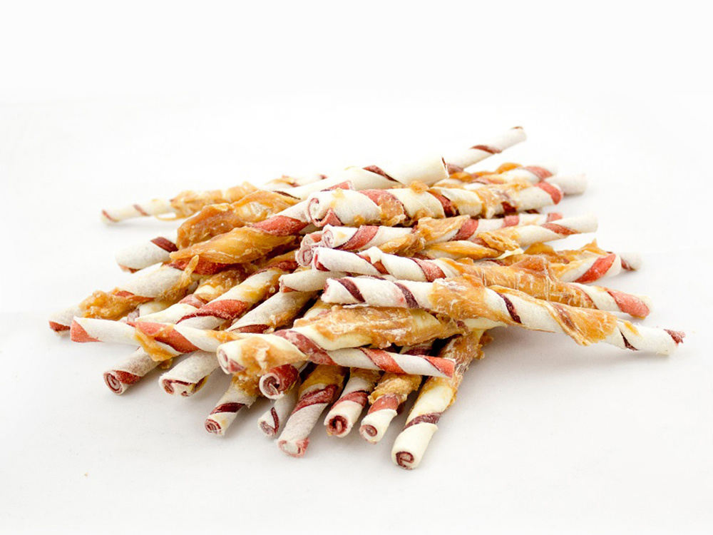 Skład: pierś z kurczaka (54%), skóra bydlęca (41,5%), konserwanty
