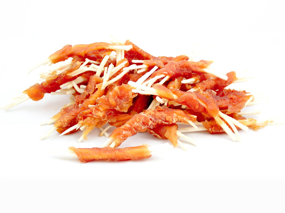 Skład: pierś z kurczaka (71,5%), skóra wołowa (20%), skrobia.