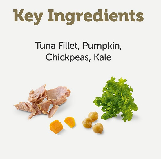 Filet z tuńczyka 45%, bulion rybny, dynia 10%, ciecierzyca 10%, jarmuż 5%.
