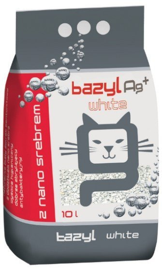 Bazyl Ag+ White to unikatowy naturalnie biały bentonit o najwyższych parametrach, wzbogacony o dobroczynne nano srebro, które jako naturalny antybiotyk ma własności antyseptyczne i dezynfekujące. Jony nano srebra działają permanentnie i zapobiegają rozwojowi bakterii i grzybów. Żwirek Bazyl Ag+ White posiada jednorodną drobną frakcję. Nie pyli, nie przykleja się do kocich łapek. Perfekcyjnie się zbryla, tworząc łatwe do usunięcia bryłki. Wchłania wilgoć i woń, pozostawiając przyjemną świeżość. Dodatek nano srebra sprawia, że kocia kuweta jest miejscem w pełni higienicznym i wolnym od zarazków oraz przykrych zapachów. Żwirki bentonitowe Bazyl Ag+ są zupełnie bezpieczne nawet dla małych dzieci i co równie ważne, przyjazne dla alergików!