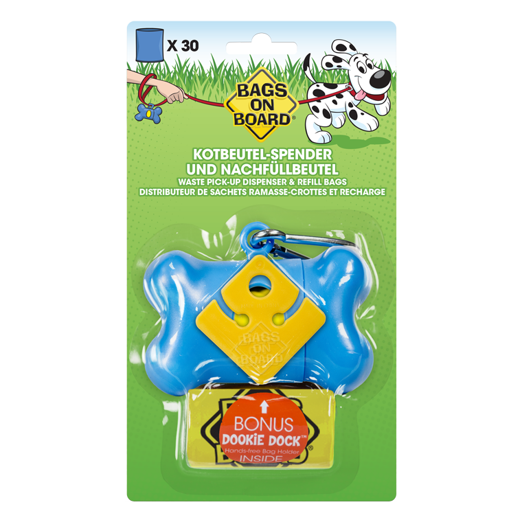 Bags on Board Podajnik na worki + 30 workwW zestawie 30 sztuk workw (2 rolki) oraz specjalna zawieszka, ktra pozwala podwiesić zawiązany worek.Rozmiar podajnika: 8 x 5,5 cm (bez uchwytu).Podajnik w kolorze niebieskim.Podajnik z karabińczykiem to uniwersalne akcesorium, ktre można przypiąć praktycznie wszędzie - np. do szlufki, smyczy, torby lub plecaka.Podajnik jest wygodny w obsłudze - wystarczy pociągnąć oba końce, aby go otworzyć i włożyć nową rolkę. Boczny otwr służy do wygodnego pobierania workw.Worki na odchody są niezbędne podczas spacerw z psem. Pozwalają zadbać o nasze otoczenie. Doskonale sprawdzają się na krtkim spacerze i w dłuższej podrży.Pomagają w prosty sposb posprzątać psie odchody i zadbać o czystość wsplnej przestrzeni - dzięki nim zachowasz higienę rąk i otoczenia.Duży rozmiar pojedynczego worka Bags on Board zapewnia odpowiednią przestrzeń aby bez problemu posprzątać odchody oraz zamknąć worek.Dzięki dołączonej zawieszce nie musisz trzymać w ręce worka do czasu napotkania kosza na śmieci.Worki są wystarczająco grube, aby zminimalizować wrażenie bezpośredniego dotykania odchodw oraz gwarantują 100% szczelność.Z podajnikiem i workami Bags on Board spacery z psem to czysta przyjemność!