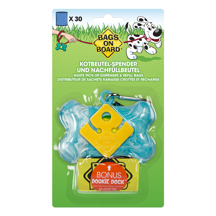 Bags on Board Podajnik na worki + 30 workwW zestawie 30 sztuk workw (2 rolki) oraz specjalna zawieszka, ktra pozwala podwiesić zawiązany worek.Rozmiar podajnika: 8 x 5,5 cm (bez uchwytu).Podajnik w kolorze turkusowym.Podajnik z karabińczykiem to uniwersalne akcesorium, ktre można przypiąć praktycznie wszędzie - np. do szlufki, smyczy, torby lub plecaka.Podajnik jest wygodny w obsłudze - wystarczy pociągnąć oba końce, aby go otworzyć i włożyć nową rolkę. Boczny otwr służy do wygodnego pobierania workw.Worki na odchody są niezbędne podczas spacerw z psem. Pozwalają zadbać o nasze otoczenie. Doskonale sprawdzają się na krtkim spacerze i w dłuższej podrży.Pomagają w prosty sposb posprzątać psie odchody i zadbać o czystość wsplnej przestrzeni - dzięki nim zachowasz higienę rąk i otoczenia.Duży rozmiar pojedynczego worka Bags on Board zapewnia odpowiednią przestrzeń aby bez problemu posprzątać odchody oraz zamknąć worek.Dzięki dołączonej zawieszce nie musisz trzymać w ręce worka do czasu napotkania kosza na śmieci.Worki są wystarczająco grube, aby zminimalizować wrażenie bezpośredniego dotykania odchodw oraz gwarantują 100% szczelność.Z podajnikiem i workami Bags on Board spacery z psem to czysta przyjemność!