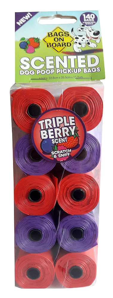 Bags on Board Triple Berry - worki perfumowane owocoweandnbsp; W zestawie 10 rolek po 14 sztuk - lacznie 140 workandoacute;w. andnbsp; Rozmiar pojedynczego worka: 22,8 x 35,5 cm andnbsp; Worki pachnace mieszanka owocandoacute;w (jagoda, truskawka, malina)Worki na odchody sa niezbedne podczas spacerandoacute;w z psem. Pozwalaja zadbac o nasze otoczenie. Doskonale sprawdzaja sie na krandoacute;tkim spacerze i w dluzszej podrandoacute;zy.Pomagaja w prosty sposandoacute;b posprzatac psie odchody i zadbac o czystosc wspandoacute;lnej przestrzeni - dzieki nim zachowasz higiene rak i otoczenia.Unikalna technologia wytworzenia workandoacute;w sprawia, ze neutralizuja nieprzyjemny zapach odchodandoacute;w.Duzy rozmiar pojedynczego worka zapewnia odpowiednia przestrzen aby bez problemu posprzatac odchody oraz zamknac worek.Worki sa wystarczajaco grube, aby zminimalizowac wrazenie bezposredniego dotykania odchodandoacute;w oraz gwarantuja 100% szczelnosc.Rolki maja szerokosc 6 cm iandnbsp; pasuja do wiekszosci podajnikandoacute;w na worki.Z workami Bags on Board spacery z psem to czysta przyjemnosc!