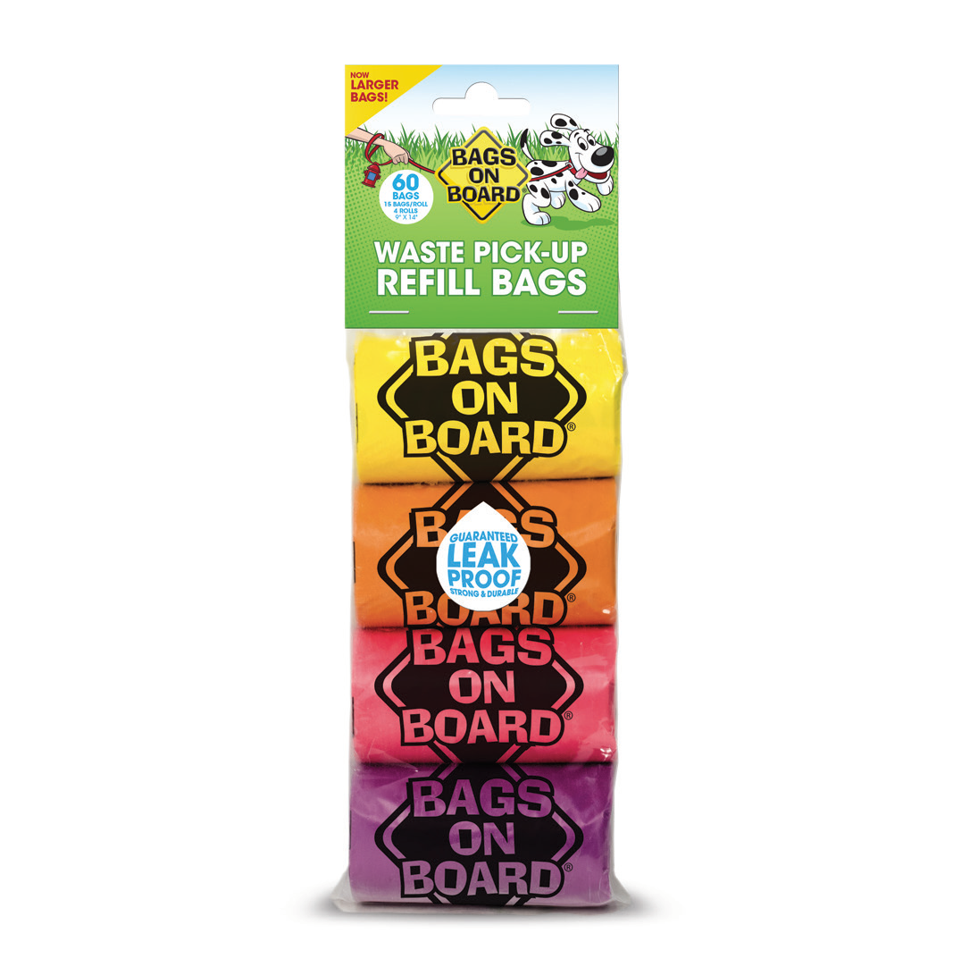 Bags on Board Worki koloroweandnbsp; W zestawie 4 rolki po 15 sztuk - lacznie 60 workandoacute;w. andnbsp; Rozmiar pojedynczego worka: 22,8 x 35,5 cm andnbsp; Worki w kolorach: zandoacute;ltym, pomaranczowym, randoacute;zowym, fioletowym.Worki na odchody sa niezbedne podczas spacerandoacute;w z psem. Pozwalaja zadbac o nasze otoczenie. Doskonale sprawdzaja sie na krandoacute;tkim spacerze i w dluzszej podrandoacute;zy.Pomagaja w prosty sposandoacute;b posprzatac psie odchody i zadbac o czystosc wspandoacute;lnej przestrzeni - dzieki nim zachowasz higiene rak i otoczenia.Zywa kolorystyka uatrakcyjnia uzytkowanie workandoacute;w.Duzy rozmiar pojedynczego worka zapewnia odpowiednia przestrzen aby bez problemu posprzatac odchody oraz zamknac worek.Worki sa wystarczajaco grube, aby zminimalizowac wrazenie bezposredniego dotykania odchodandoacute;w oraz gwarantuja 100% szczelnosc.Rolki maja szerokosc 6 cm iandnbsp; pasuja do wiekszosci podajnikandoacute;w na worki.Z workami Bags on Board spacery z psem to czysta przyjemnosc!