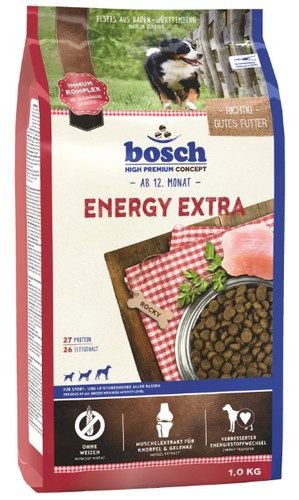 - Energy Extra - Pełnoporcjowa karma dla sportowych i wyczynowych psów wszystkich ras Składniki : białko drobiowe suszone (25%), jęczmień, kukurydza, tłuszcze zwierzęce, białko wieprzowe suszone,...