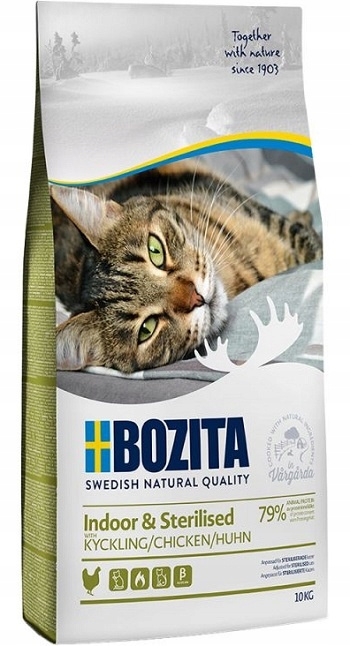 Bozita Indoor & Sterilised z kurczakiem to pełnoporcjowa, zbilansowana karma dla dorosłych kotów. Karma została dostosowana do nieco niższych potrzeb energetycznych kotów po sterylizacji oraz przebywających w domu, co czyni ją również odpowiednią dla kotów starszych lub cierpiących na nadwagę. Zawartość świeżego kurczaka przyczynia się do zwiększenia walorów smakowych oraz strawności karmy, ułatwiając kotu przyswajanie składników odżywczych. L-karnityna transportuje kwasy tłuszczowe do komórek i stanowi niezbędny element procesów metabolicznych kota.