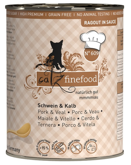 • Catz Finefood Ragout N.609 - Wieprzowina i cielęcina ze słodkimi ziemniakami i cukinią Delikatne kawałki, wyselekcjonowane naturalne mięso w postaci odpowiedniej wielkości kąsków w pysznym sosie....