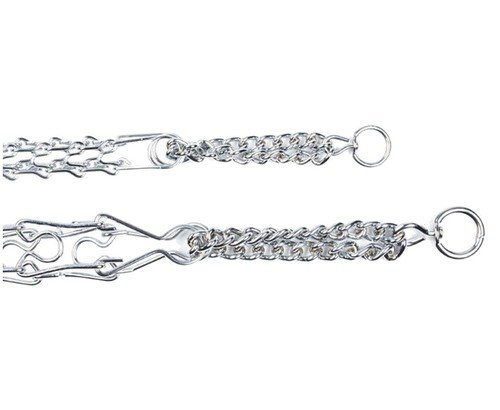 Oba końce właściwej obroży połączone są dodatkowo łańcuszkiem zaciskowym potęgującym efekt szkoleniowy.
