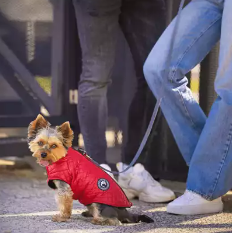 - Piękna kurteczka zasuwana od góry z regulacją klatki. Zapięcie do smyczy na górze ubranka. Ubranko dla pieska bardzo stylowe