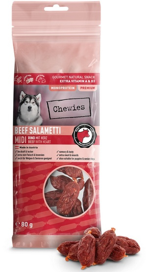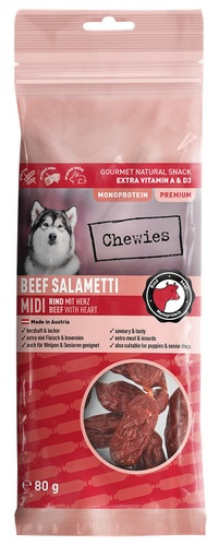 - Chewies BEEF SALAMETTI MIDI wołowina z sercami Naturalna ekstra kiełbasa z sercem! Czy Twój pies też uwielbia salami i ser? Połączyliśmy oba składniki i tak powstały nasze obfite, pyszne Chewies...