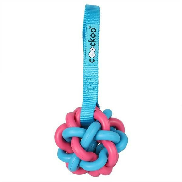 Kolorowa zabawka dla psa Coockoo Zed składa się z sześciu jednakowych gumowych pierścieni, które są ze sobą splecione, tworząc niebiesko-różową kulkę. Uchwyt z taśmy może być używany do rzucania piłką, do trzymania jej podczas zabawy lub do gryzienia przez psa. Zed z pewnością zapewni Twojemu psu wiele godzin zabawy i przyjemności żucia, a także pomoże zadbać o jego zęby.