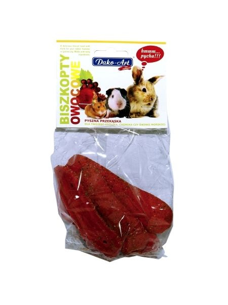Dako-Art Owocowe biszkopty dla gryzoni-zawieszka- to przysmak dla gryzoni stanowiący urozmaicenie codziennej diety. Biszkopty powodują ścieranie się siekaczy.