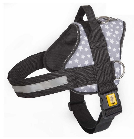 - Z przodu znajduje się pasek zapinany, regulowany na rzep. Na nim zaś przyszyty jest element odblaskowy, co sprawia, że Twój pupil jest doskonale widoczny po zmroku.