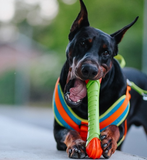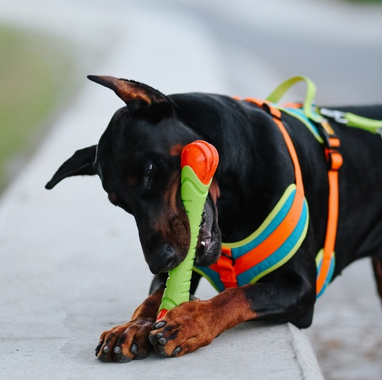Aport dla psa posiada w środku piszczałkę, która dodatkowo zachęca do zabawy, podczas której pies masuje dziąsła i zaspokaja potrzebę żucia.