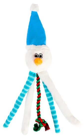 Świąteczna zabawka dla psa szeleszczący bałwan jest stworzona z plecionego, bawełnianego sznura, pluszowego oraz polarowego materiału wypełnionego szeleszczącym wnętrzem. Pośród wypełnienia znajduje się piszczałka, pobudzająca do zabawy.