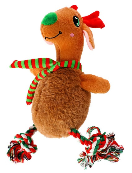 Świąteczna zabawka dla psa renifer ze sznurkami jest stworzona z pluszowego tułowia, który posiada nóżki z plecionego, bawełnianego sznura. W zabawce znajduje się bezpieczny wypełniacz. Pośród wypełnienia znajduje się piszczałka, pobudzająca do zabawy.