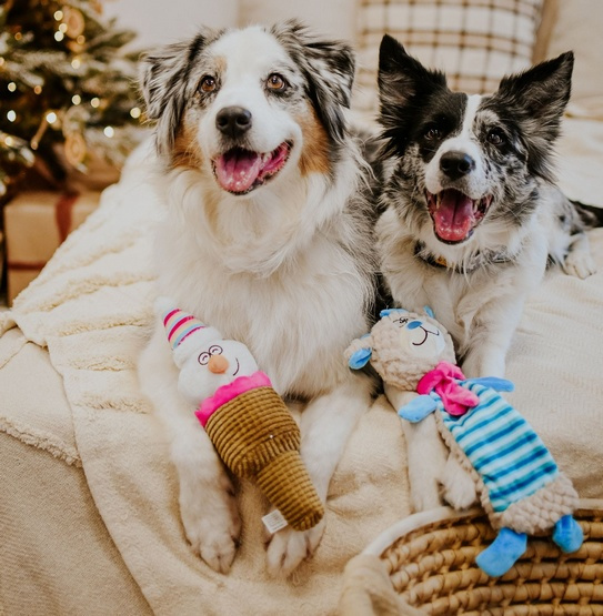 Świąteczna zabawka dla psa jest stworzona z płaskiego, polarowo - pluszowego materiału, a wewnątrz znajduje się bezpieczny wypełniacz. Pośród wypełnienia znajduje się szeleszczący materiał i piszczałka, pobudzające do zabawy.