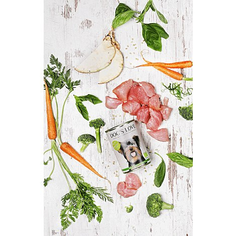 - Ekologiczna karma dla psa z samego mięsa mięśniowego kurczaka i dodatkiem selera, bazylii, brokułów i gryki .