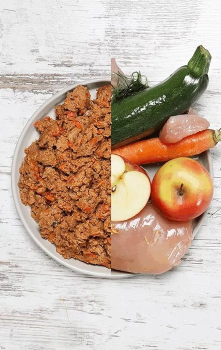 SKŁAD: Mięso drobiowe 60% (mięso mięśniowe z indyka 21%, mięso mięśniowe z kurczaka 21%, serca z kurczaka 16%, wątróbka z kurczaka 2%), marchew 18%, cukinia 7%, jabłka 3%, minerały, olej z krokosza, olej z łososia, proszek ze skorupek jaj, liście pokrzywy, kwiaty nagietka, algi morskie.