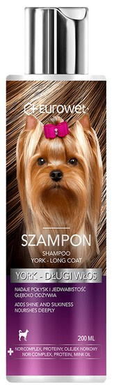 - EUROWET Szampon dla yorków - długi włos Nadaje połysk i jedwabistość. Głęboko odżywia Nori Complex, proteiny, olejek norkowy Właściwości i działanie: Szampon zawiera substancje mające właściwości...