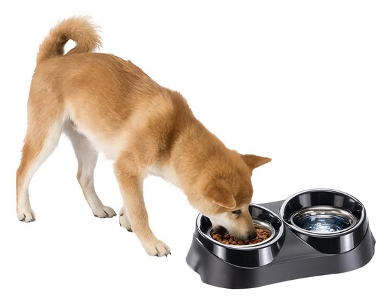 Zestaw pełni rolę podwójnej miski - plastikowa podstawa z dwoma wgłębieniami na miski ze stali nierdzewnej. Uchwyt (podstawka) na miski jest antypoślizgowy i ergonomicznie wyprofilowany.