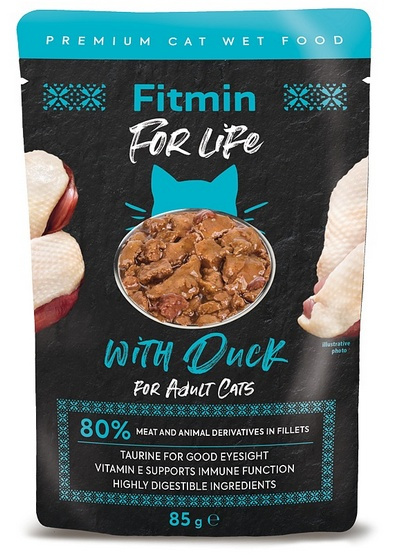 - FITMIN FOR LIFE CAT Pełnoporcjowa karma dla dorosłych kotów. Twój kot uwielbia saszetki i kaczkę? Oferujemy wspaniały smak mięsa z kaczki w saszetce zawierającej aż do 80% mięsa. Pyszna karma w...