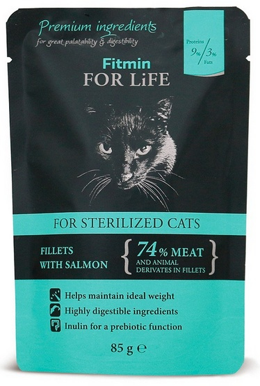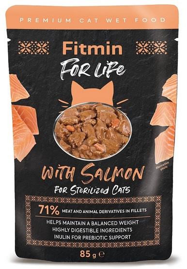 - FITMIN FOR LIFE CAT Pełnoporcjowa karma dla dorosłych sterylizowanych kotów. 74% MIĘSA I PRODUKTÓW POCHODZENIA ZWIERZĘCEGO W FILETACH Pomaga utrzymać idealną wagę. Lekkostrawne składniki Inulina...