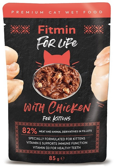 - FITMIN FOR LIFE CAT Pełnoporcjowa karma dla kociąt. Fileciki z kurczakiem w sosie. 82% MIĘSA I PRODUKTÓW POCHODZENIA ZWIERZĘCEGO W FILETACH Specjalna formuła dla kociąt. Wzmocnienie systemu...