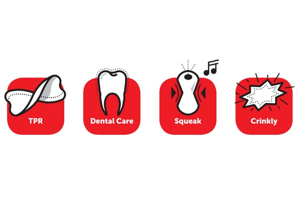 - Zabawki posiadają wypustki, które przy gryzieniu masują dziąsła psa i zapobiegają osadzaniu się kamienia nazębnego.