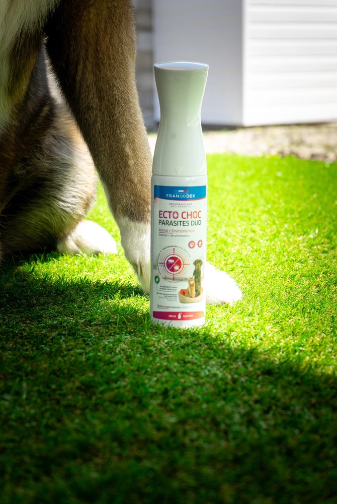 Mgiełka ECTO CHOC PARASITES DUO FRANCODEX bez spłukiwania działa natychmiastowo w przypadku inwazji pasożytów zewnętrznych i jest odpowiednia do stosowania zarówno na zwierzę, jak i w jego otoczeniu. Preparat otacza pasożyta wilgotną warstwą, która go unieruchamia i sprawia, że staje się niezdolny do aktywności. Czysto mechaniczne działanie mgiełki oraz składniki wyłącznie roślinnego pochodzenia sprawiają, że jest ona całkowicie bezpieczna. Produkt po użyciu pozostawia przyjemny, odświeżający zapach.